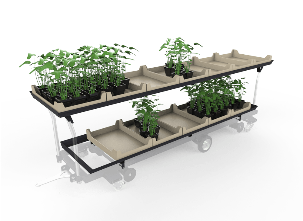 The frame for plant trays is used when planting new crops in the greenhouse. The frame is mounted on the undercarriage of a Bo Cart harvesting cart. There are different types of frames available.